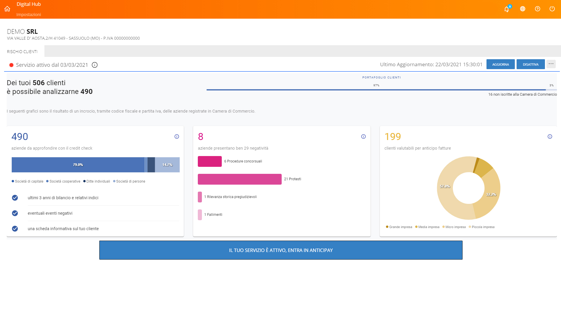 Credit Check è integrato con Digital Hub Zucchetti: con un unico login tieni sempre sotto controllo Clienti e Fornitori.