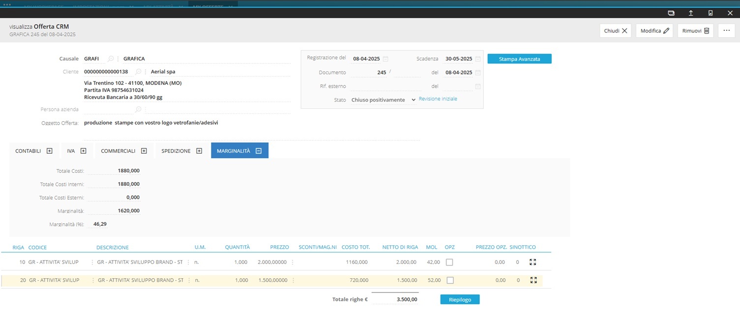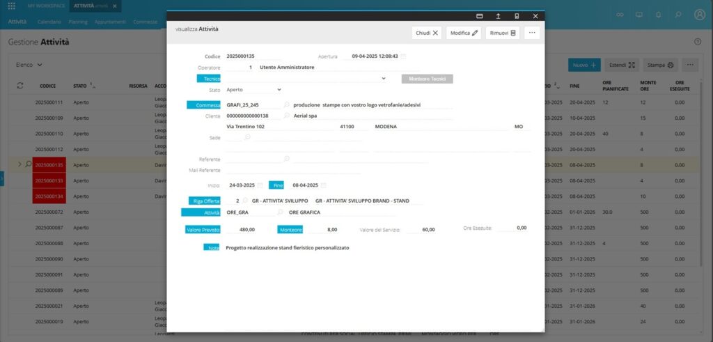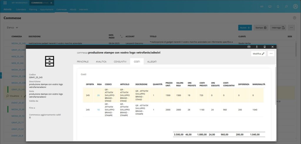 Offre un sistema completo per gestire l’intero ciclo di vita della commessa: dalla creazione dell’offerta con stima della marginalità, alla pianificazione operativa, fino al monitoraggio in tempo reale delle attività.